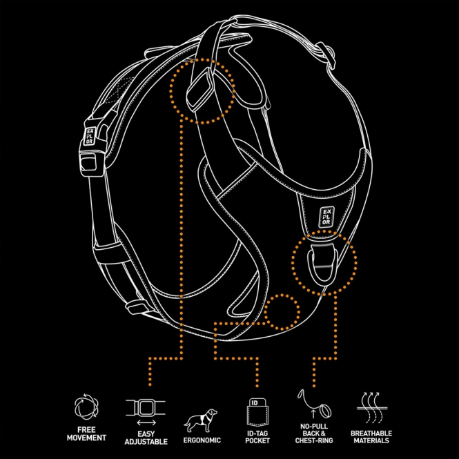 Mit dem EXPLOR Ultimate Fit No-Pull-Geschirr, einem gut durchdachten, ergonomischen Hundegeschirr, das ideal für einen täglichen Stadtspaziergang oder auch ein großes Outdoor-Abenteuer ist, sind Sie unterwegs immer auf Tuchfühlung. Ihr Hund genießt optimale Bewegungsfreiheit, weil der durch Ziehen an der Leine verursachte Druck gleichmäßig über die Brust verteilt wird. So werden lebenswichtige Organe im Nacken geschützt. Das Geschirr verfügt über zwei Befestigungsringe aus Edelstahl: einem auf dem Rücken, der für ruhige oder ältere Hunde geeignet ist, die leicht zu kontrollieren sind und einem verstärkten D-Ring im Brustbereich, um Hunde, die an der Leine ziehen, zu kontrollieren. Das EXPLOR Ultimate Fit No-Pull-Geschirr ist um den Nacken und die Brust herum verstellbar, wodurch es, in Kombinatin mit den stapazierfähigen Materialien, für fast alle Hunde geeignet ist. Die Schnallen sind um die Mitte herum angebracht, so dass der Hund kein(e) Bein(e) anheben muss, wenn das Geschirr angelegt wird. Um das Fell und die Haut des Hundes vor Wundscheuern zu schützen, sind die meisten der Riemen und Schnallen mit weichen, atmungsaktiven Materialien überzogen. Außerdem trocknen die leichten, aber hochwertigen Stoffe, die sowohl für die Innenseite als auch für die Außenseite verwendet werden, schnell, was sehr praktisch ist, wenn Ihr Hund gerne schwimmen geht. Um zu verhindern, dass sich Ihr Hund beim freien Laufen an Ästen verfängt, hat das Geschirr keine Schlaufen oder abstehenden Teile. Das EXPLOR Ultimate Fit berücksichtigt auch die Sicherheit Ihres Hundes im Straßenverkehr. Die reflektierenden Paspeln sind an den richtigen Stellen angebracht und sorgen für optimale Sichtbarkeit im Straßenverkehr. Außerdem gibt es im Brustbereich des Geschirrs eine spezielle Innentasche für einen ID-Anhänger, so dass der Anhänger  leicht zugänglich und unbeschädigt bleibt. Rausgehen und ERKUNDEN!
