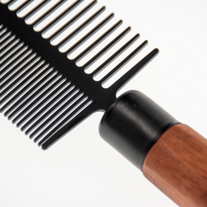 Dieser doppelseitige Kamm von Noir Japandi hat 17 Zähne auf der einen und 35 auf der anderen Seite und ist das ganze Jahr über für eine gute Grundpflege geeignet. Der Kamm dient vor allem dazu, das Fell schön und frei von Verfilzungen zu halten. Die rotierenden und abgerundeten Zähne gehen leicht durch das Fell und ermöglichen das Auskämmen der Verfilzungen. Der Kamm ist für Hunde und Katzen geeignet. Er hat einen ergonomischen Griff aus FSC-zertifizierter Buche mit dunkel gebeizter Oberfläche.