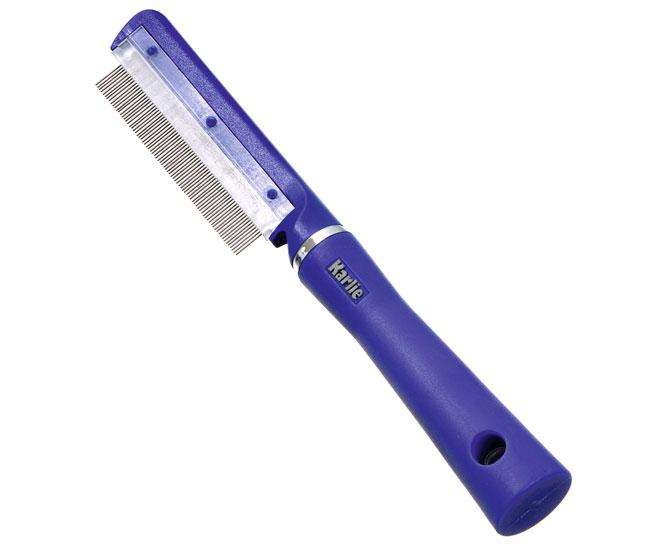 Blauer Flohfänger mit rotierenden Zähnen für Katzen aus der Karlie Perfect Care Pflegeserie.