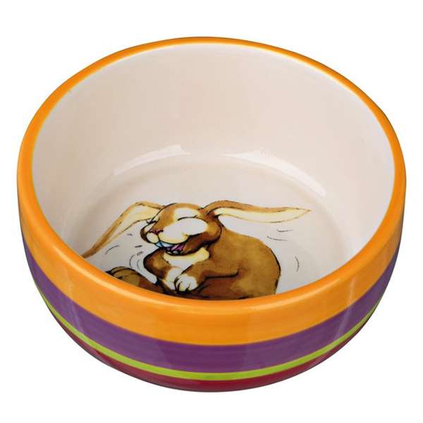 Sehr schöner bunter Keramiknapf mit witzigem Hasenmotiv für Kaninchen.